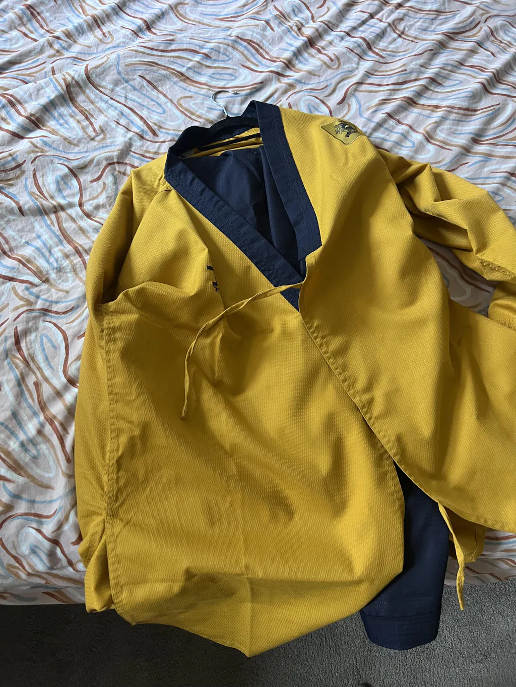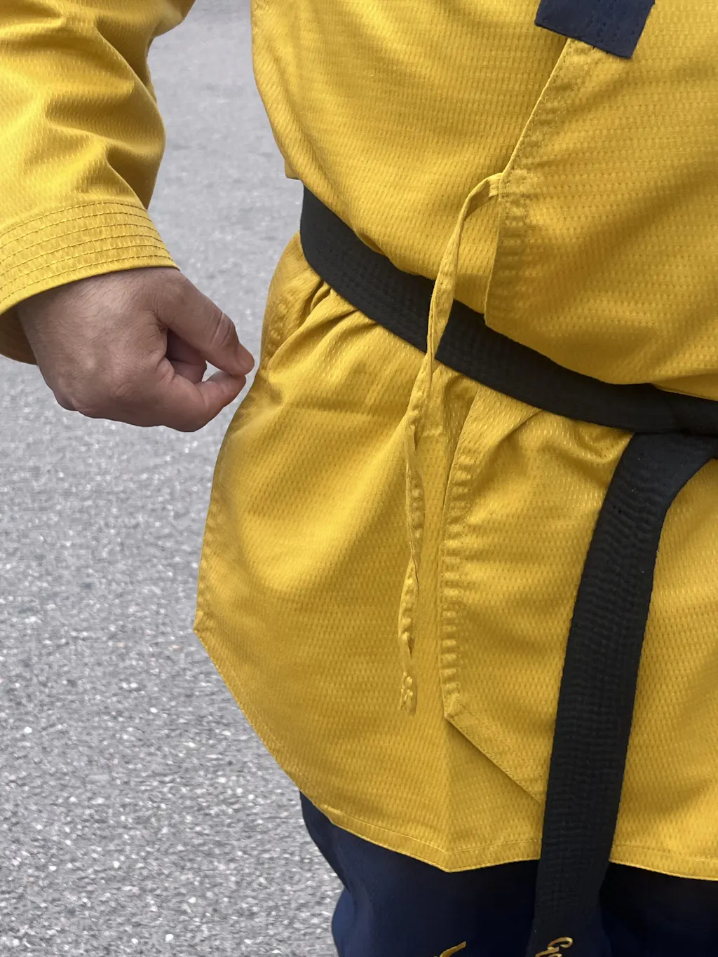 The JC Poomsae Master Pro-Athlete Dan Uniform, WT Approved, is designed for elite Taekwondo practitioners in the MASTER Division. This high-quality uniform features a gold-colored jacket made from a blend of 65% polyester and 35% cotton, ensuring durability and comfort. The black pants are 100% polyester, offering lightweight breathability essential for performance. The Y-neck collar and tailored fit enhance mobility and presentation during Poomsae routines. This uniform, recognized by the World Taekwondo Federation, is perfect for those seeking to elevate their practice with professional-grade attire.